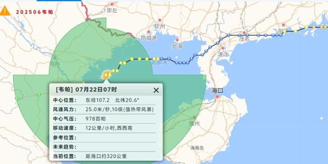 海南省气象局发布消息,今年第6号台风“韦帕”(强热带风暴级)于7月22日7时位于北纬20.6度、东经107.2度的北部湾海面上,中心附近最大风力达到10级(25米/秒)。预计,“韦帕”将以每小时10~15公里的速度向西偏南方向移动,强度变化不大,并将于当天中午到傍晚在越南北部沿海再次登陆,登陆时为热带风暴级或强热带风暴级(9~10级,23~25米/秒),之后继续向西偏南方向移动,强度逐渐减弱。