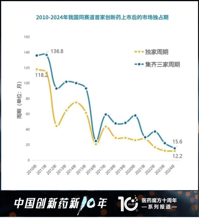 注:独家周期系指同赛道新药的首家上市日期与第二家上市日期的时间差;集齐三家周期系指同赛道新药首家上市日期与第三家上市日期的时间差(图片来源:医药魔方十周年系列报告《全球视野下的中国创新药产业:十年回顾与展望》)