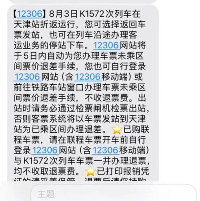 K1572次列车由吉林站始发,目的地为西安,全程约33小时39分,途经河北、山西等地。张先生收到的12306短信显示,3日K1572次列车在天津站折返运行,乘客可选择返回车票发站,也可在列车沿途停站下车。12306网站将在5日内自动办理车票未乘区间票价退差手续,不收取退票费。