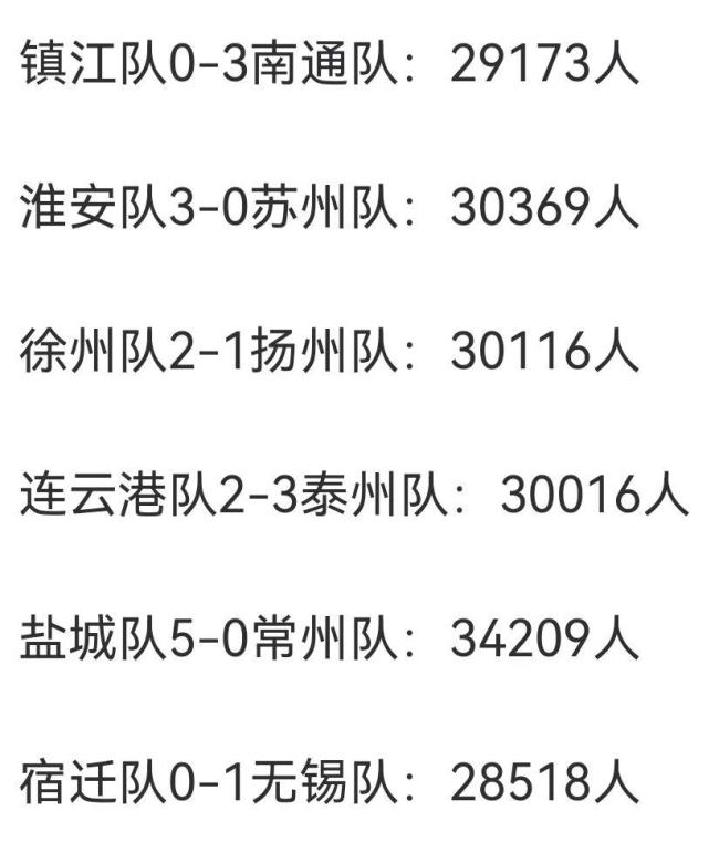 江苏省城市足球联赛第八轮比赛结束,六场比赛全部分出胜负,场均打进3.3个进球。六个主场全部爆满,场均超过30000名观众涌入赛场,尽管拥有最大场地的南京本轮轮空。