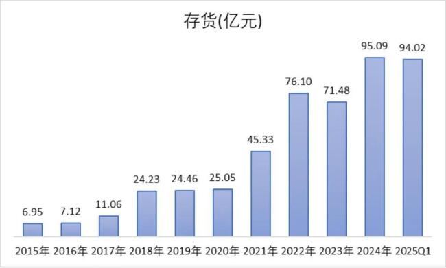 外销不利,公司生产的光伏产品大量变成了库存,截至2024年末,公司存货规模超过95亿元,同比增长33.02%,创下历史峰值,其中库存商品占据大头。
