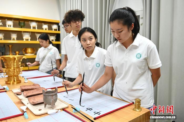 8月6日,华裔大学生在合肥学写毛笔字。记者韩苏原 摄