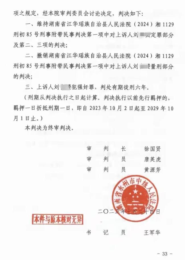 2025年7月24日,永州市中级人民法院二审判定事实清楚,但认为原判过重,改判六年有期徒刑。理由包括“没有使用暴力威胁”和“没有造成严重后果”。判决书回应了刘志军的疑问:录像无声音是因为机器故障,不影响证据效力;小孩记不清一些细节是正常现象。