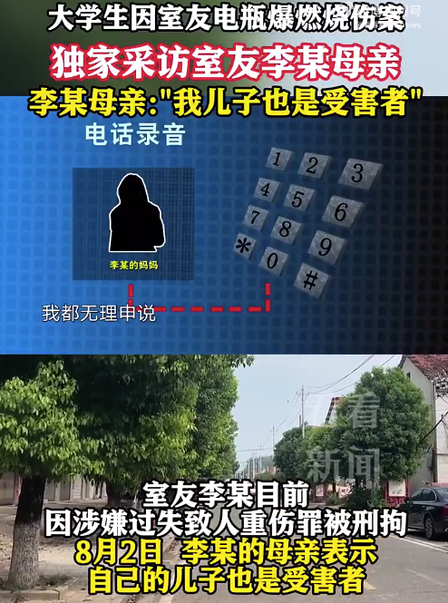 8月2日,记者通过电话独家采访到武汉室友电瓶爆燃烧伤案的室友小李的母亲。如今,小李因涉嫌过失致人重伤罪被刑事拘留。小李母亲一上来就诉苦说:“我自己的儿子也是受的无妄之灾,我都无理申说,还要去伤心。”小李母亲承认“电瓶是自己儿子拿上去充电的,”但认为“他也是受害者,”因为小李母亲认为电瓶车租赁商也有责任,“是一个好的电瓶车,它会爆炸吗?”但被烧伤的大学生杜均浩父亲告诉我们,在今年4月11日的庭前调解会上,电瓶车租赁商曾表示无论电瓶好坏,电瓶都不能入户充电。面对李某母亲这样的说法,杜家人表示非常寒心。事发一年至今,杜家人称只收到过他们给予的一万元赔偿,几乎每次与李某家属的通话都会不欢而散。而在去年年底李某因涉嫌过失致人重伤罪被刑拘时,李家人曾表示愿意再出五万元给杜家,但要求杜家必须签署谅解书。