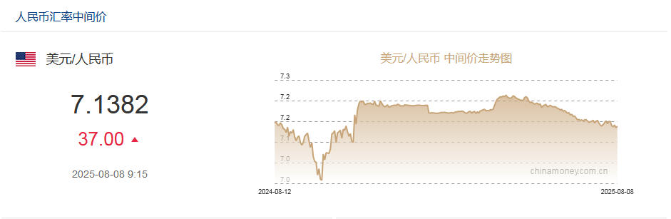 中新网8月8日电 据中国外汇交易中心网站消息,中国人民银行授权中国外汇交易中心公布,2025年8月8日银行间外汇市场人民币汇率中间价为:1美元对人民币7.1382元。
