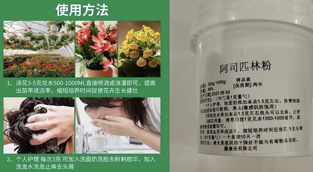 而对于阿司匹林粉末的使用,同济大学附属东方医院药学部副主任药师黄国鑫表示,不提倡使用此类产品洗头洗脸,严禁农业用阿司匹林直接用于人体。
