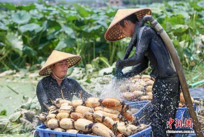 8月9日,在广西贺州市平桂区沙田镇马峰村,藕农正在采收莲藕。黎豪图 摄