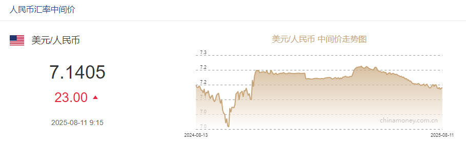 中新网8月11日电 据中国外汇交易中心网站消息,中国人民银行授权中国外汇交易中心公布,2025年8月11日银行间外汇市场人民币汇率中间价为:1美元对人民币7.1405元,下调23个基点。