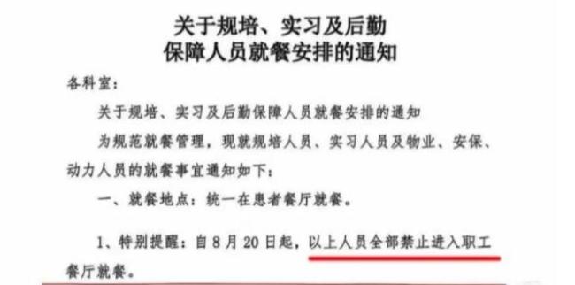 8月9日,陕西榆林市中医医院就网友反映的“中医院自8月20日起禁止规培生、实习生及后勤人员进入职工餐厅就餐”的情况进行了说明。医院表示高度重视,并立即召开专题会议研究。