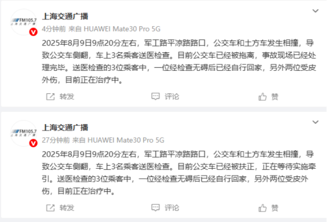 上海公交车与土方车碰撞侧翻 3名乘客送医检查