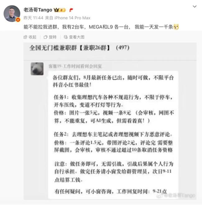 8月6日下午,理想汽车第一产品线总裁汤靖发微博曝光理想遭到黑水军抹黑。其发布的兼职群聊天截图显示,该水军兼职群中有两个任务。任务1,收集理想汽车各种不规范行为,不限于停车、开车压线、变道不打灯等,图片一张5元,视频一条8元(会审核,网图不算,不能重复,可AI生成,但需看着真);任务2,去理想车主笔记或者理想视频下方恶意评论,一条评论1.5元,带图评论2元(评论完需要整屏截图,会审核,审核不通过超过10条取消任务资格)。该任务还额外标注,完成上述任务即可,无需引战。