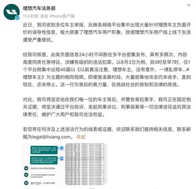紧接着,8月7日上午,理想法务部发声,称近期收到多位车主举报,反映各网络平台集中出现大量针对理想车主负面评价的误导性信息,极大损害了理想汽车用户形象,致使理想汽车用户线上线下生活遭受严重侵扰。