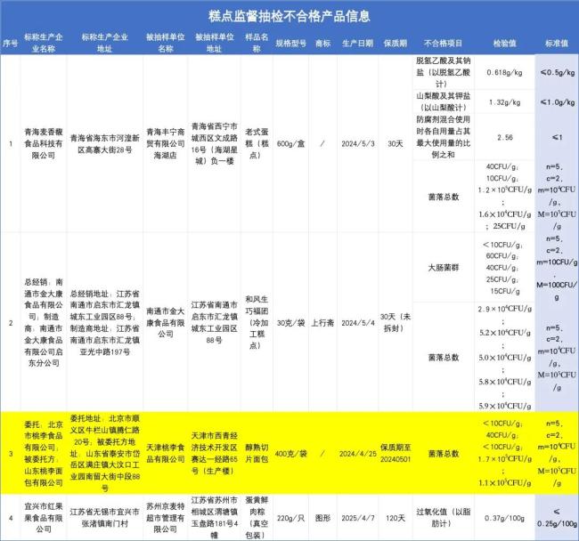 2020年12月,桃李面包旗下子公司天津桃李生产的纯蛋糕,经抽样检验显示菌落总数项目不符合食品安全国家标准。