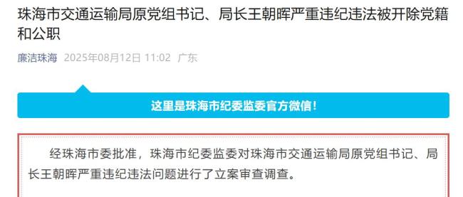 据廉洁珠海消息:经珠海市委批准,珠海市纪委监委对珠海市交通运输局原党组书记、局长王朝晖严重违纪违法问题进行了立案审查调查。