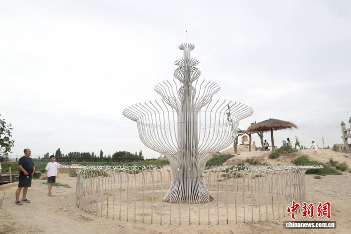 8月13日,宁夏银川,游客在镇北堡西部影视城参展的艺术作品前拍照打卡。中新社记者 于晶 摄