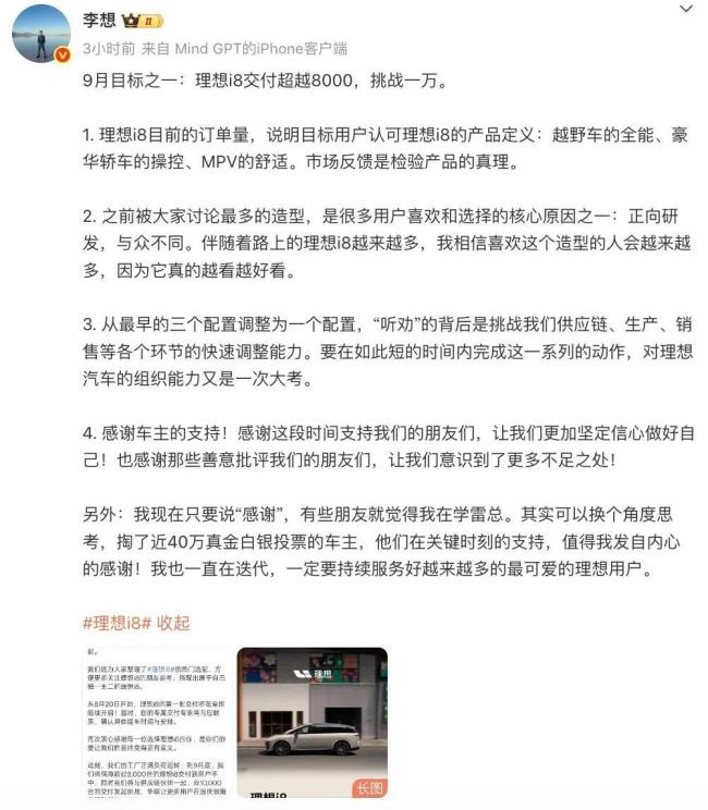 电车失败理想要崩?想多了!李想爆料:i8九月销量保八千冲1万!