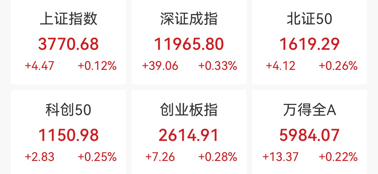 中新经纬8月21日电 21日早盘,A股三大指数集体高开。上证指数涨0.12%,报3770.68点;深证成指涨0.33%,报11965.80点;创业板指涨0.28%,报2614.91点。