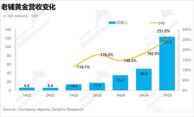 25H1老铺黄金实现总营收123.5亿元,同比增长251%,接近指引上限。从趋势上看,从24H1开始公司的业绩连续两次环比提速,仍然处于快速扩张期,上半年收入超过了去年全年,核心还是受益于黄金的上行周期以及老铺品牌力不断提升带来的客群拓展和破圈。