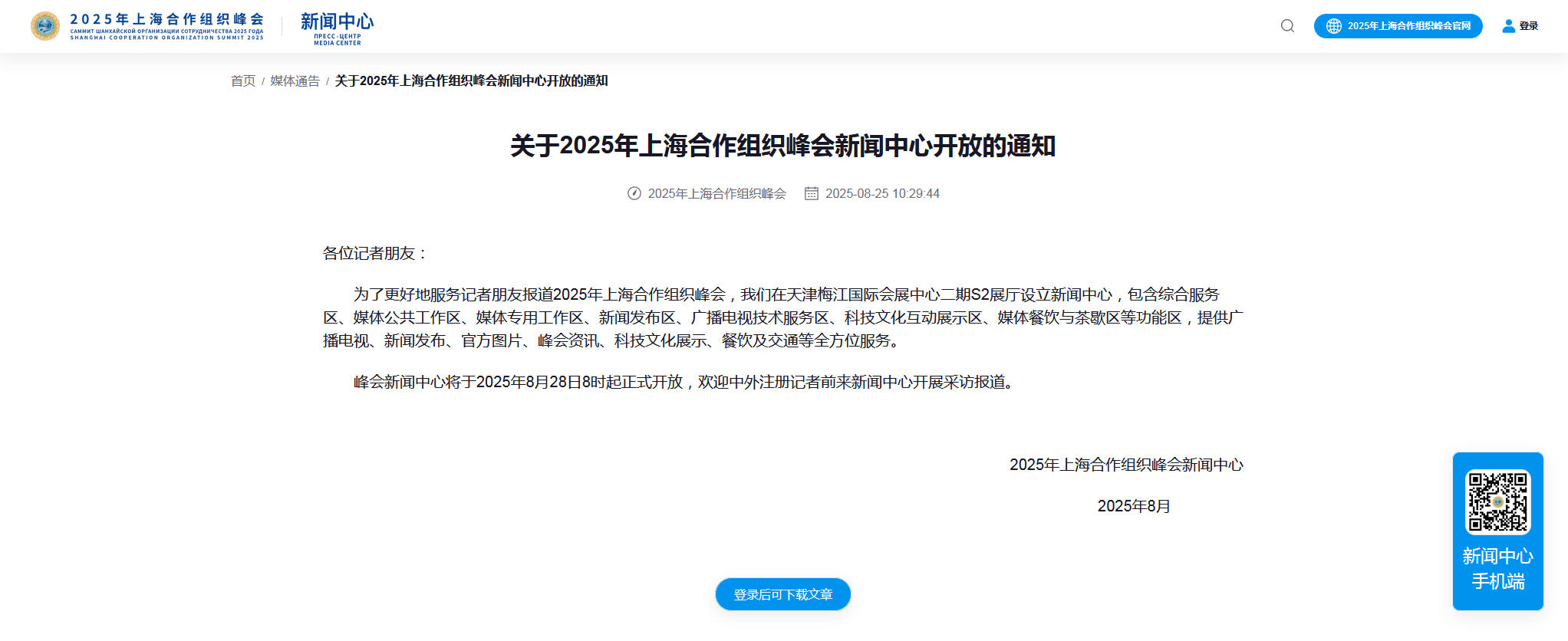 2025年上海合作组织峰会新闻中心将于8月28日开放