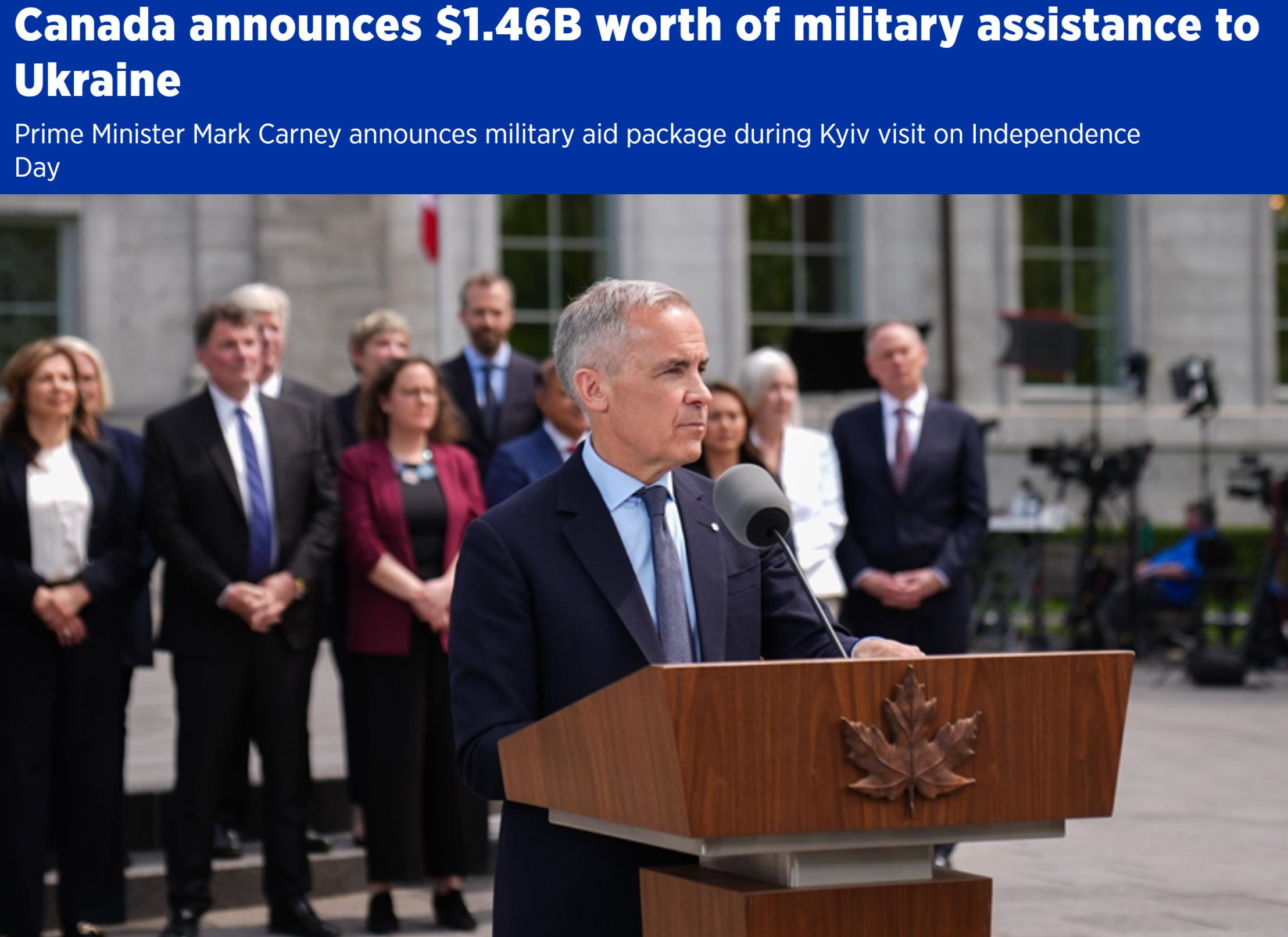 同一天,到访乌克兰的加拿大总理卡尼宣布,加拿大将于今年9月向乌克兰移交价值超过10亿美元的武器装备。