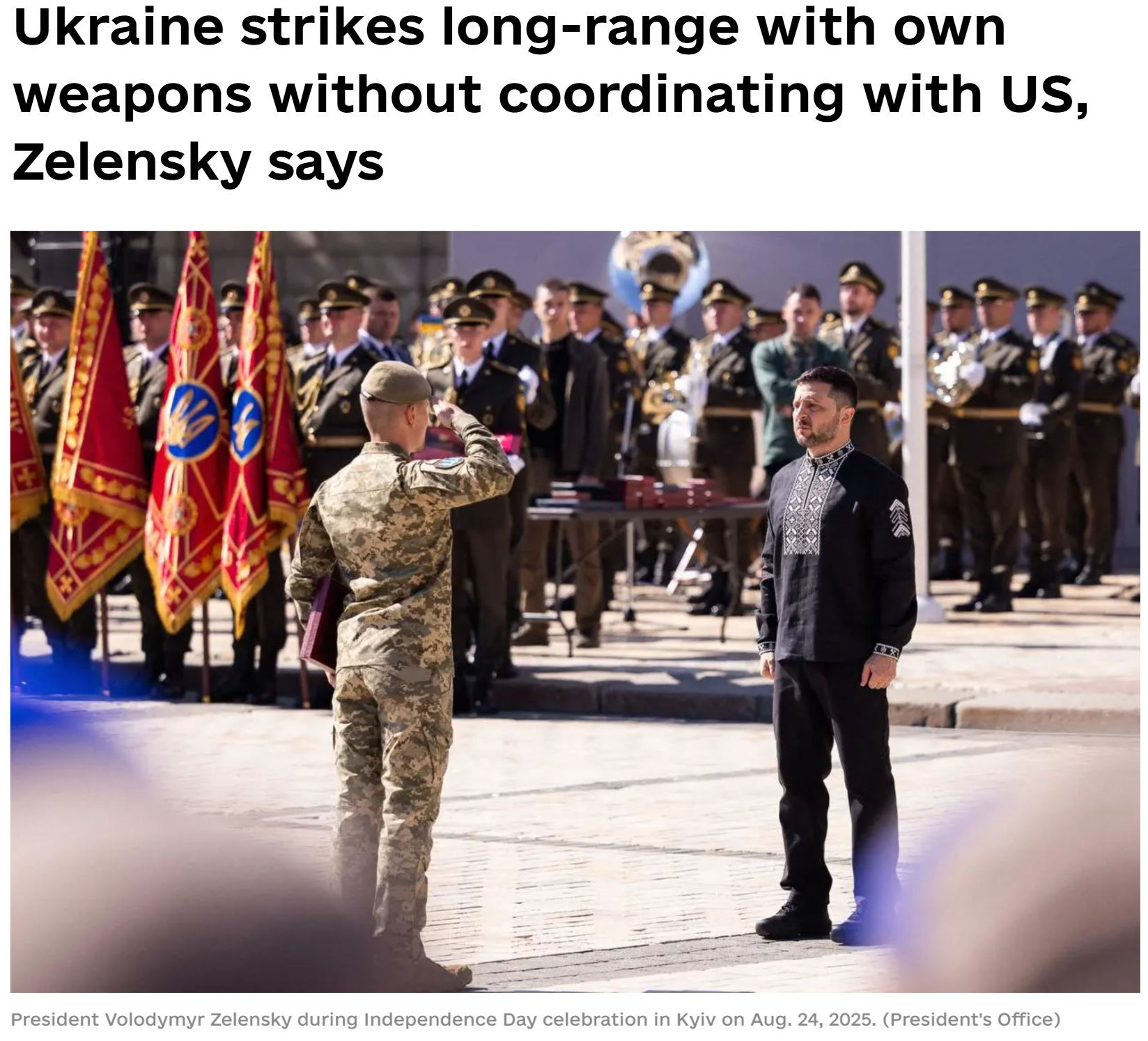 乌克兰总统泽连斯基24日在与到访的加拿大总理卡尼举行的联合记者会上表示,乌克兰使用国产远程武器打击俄罗斯境内目标,并已不再就此类行动与美国讨论。他说,就此类行动与美方进行协调是“很久以前的事了”。