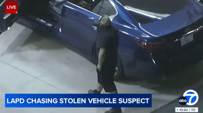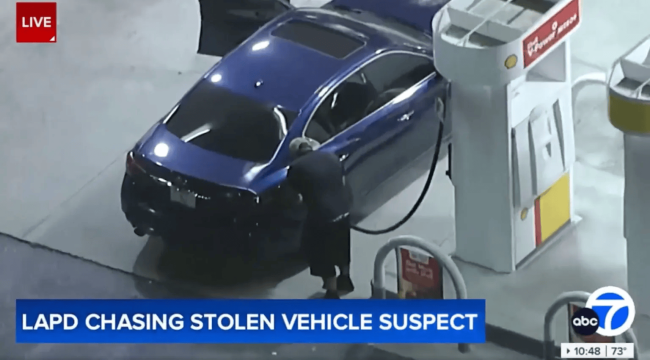 这名男子驾驶一辆被盗的蓝色英菲尼迪轿车,在加油站停下加油。此前,警方与该车进行高速追逐,车速一度达到每小时100英里。视频显示,该男子神情紧张,一边为车辆加油,一边用衬衫遮住脸部,并在驾驶座附近来回踱步。现场附近没有警车追上,该男子用超过一分钟的时间完成加油。