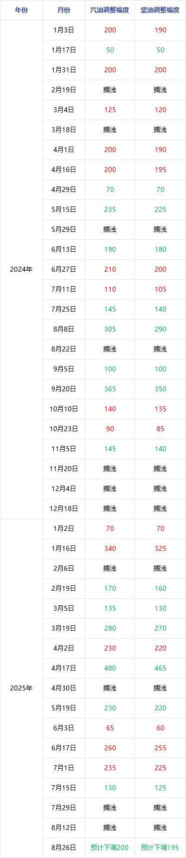 成品油价格或迎年内第七跌 下调幅度约200元/吨。原油变化率出现负向波动,预计成品油价格将结束搁浅迎来下调。根据隆众资讯成品油分析师刘炳娟的预测,2025年8月26日24时,国内汽柴油价格将下调约200元/吨,这是年内第七次下调。对于私家车主来说,加满70升油箱将节省大约10元。