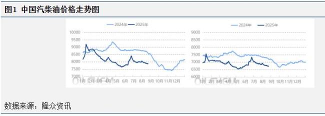 本轮调价周期内,国际原油价格维持弱势,导致成品油调价幅度一直在下调区间。截至8月22日,参考原油均价为66.06美元/桶,较上一周期下跌4.29%,预计调价窗口开启时,成品油下调幅度约为200元/吨。供应端方面,OPEC+坚定增产立场,计划在9月继续维持每日54.8万桶的较大增产力度,并提前完成原定的220万桶/日增产目标。然而,美国对部分产油国的制裁尚未取消,地缘局势仍存在不确定性,潜在供应风险仍然存在。