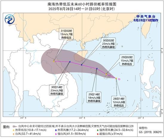 该热带低压将缓慢增强,是否能加强为今年第14号台风“蓝湖”还存在不确定性。目前,南海的海温在27至28℃,北侧垂直风切变较小,南侧和西侧较大,不利于热带系统的发展增强。预计该低压或于30日早晨从海南南部近海掠过,30日夜间可能登陆越南,总体路径类似之前的台风“剑鱼”,但强度明显弱于“剑鱼”。