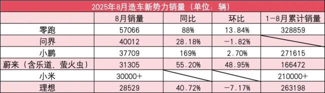 8月新势力销量榜:零跑飙至5.7万!小鹏蔚来创新高,理想跌破3万
