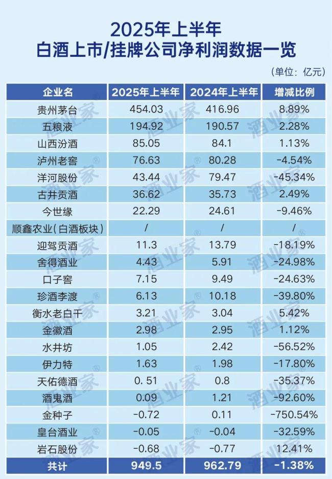 根据财报,20家白酒上市企业(除去未披露白酒业务利润的顺鑫农业)2025年上半年归母净利润共计为949.5亿元,较2023年的962.79亿元,减少了13.29亿元,同比下滑1.38%。