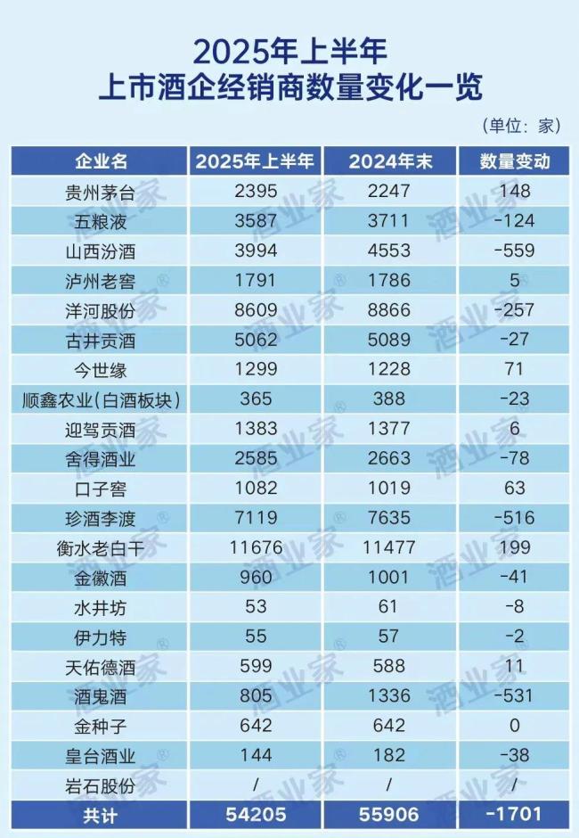 据酒业家统计,20家上市白酒公司(剔除岩石股份)在2025年上半年共计净减少经销商1701家,而2024年末的数据为净增长1970家,整体经销商规模出现明显收缩。