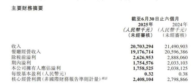 业绩方面,上半年,海底捞实现营收207.03亿元,同比下降3.7%;集团核心经营利润(非国际财务报告准则计量)24.08亿元,同比下降14.0%;利润17.546亿元,同比下降13.7%。