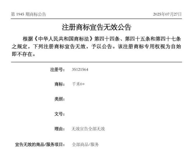 而据极目新闻报道,国家知识产权局商标局官网第1945期商标公告《注册商标宣告无效公告》显示,根据《中华人民共和国商标法》第四十四条、第四十五条和第四十七条之规定,下列注册商标宣告无效,予以公告。其中包含,千禾味业食品股份有限公司注册号为35121564的商标“千禾0+”。