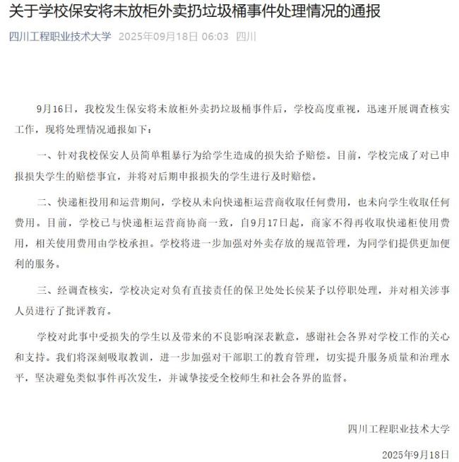 9月18日,四川工程职业技术大学就学校保安将学生外卖扔进垃圾箱一事发布了情况通报。9月16日,该校发生了保安将未放入快递柜的外卖扔进垃圾桶的事件,学校对此高度重视并迅速开展调查核实工作。