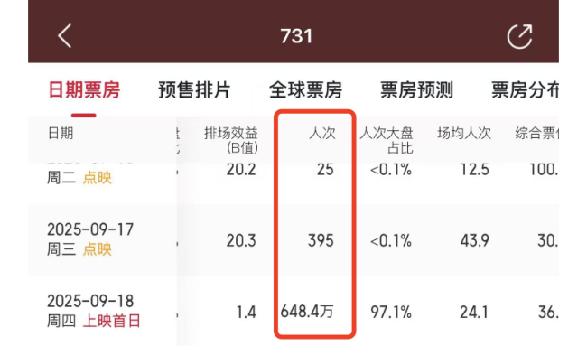 除单日场次纪录外,《731》还一举打破中国影史单片单日总场次冠军等10项重要纪录,并累计斩获包括2025年9月战争片内地票房冠军、2025年第37周内地票房冠军在内的37项行业里程碑。