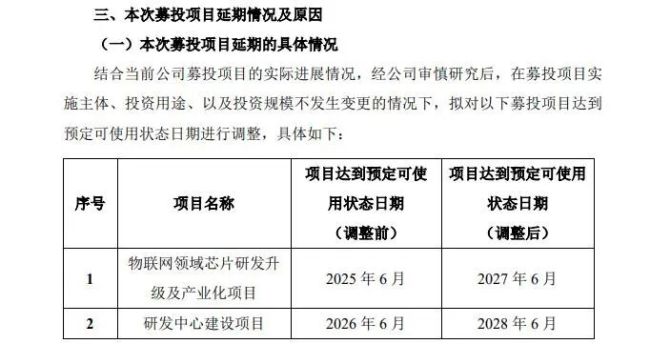 2025年2月,安凯微公告显示,公司董事会同意将“物联网领域芯片研发升级及产业化项目”、“研发中心建设项目”达到预定可使用状态时间分别延长至2027年6月和2028年6月。
