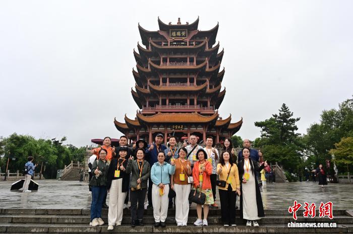 图为海外华文媒体代表在黄鹤楼前合影。刘康 摄