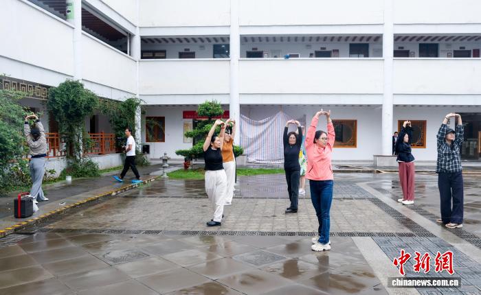 图为海外华文媒体代表在健民叶开泰中医药文化园体验八段锦。中新社记者 张畅 摄