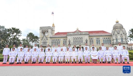 9月24日,泰国总理阿努廷·参威拉军(前中)及新一届内阁成员在位于首都曼谷的总理府合影。新华社发(拉亨摄)