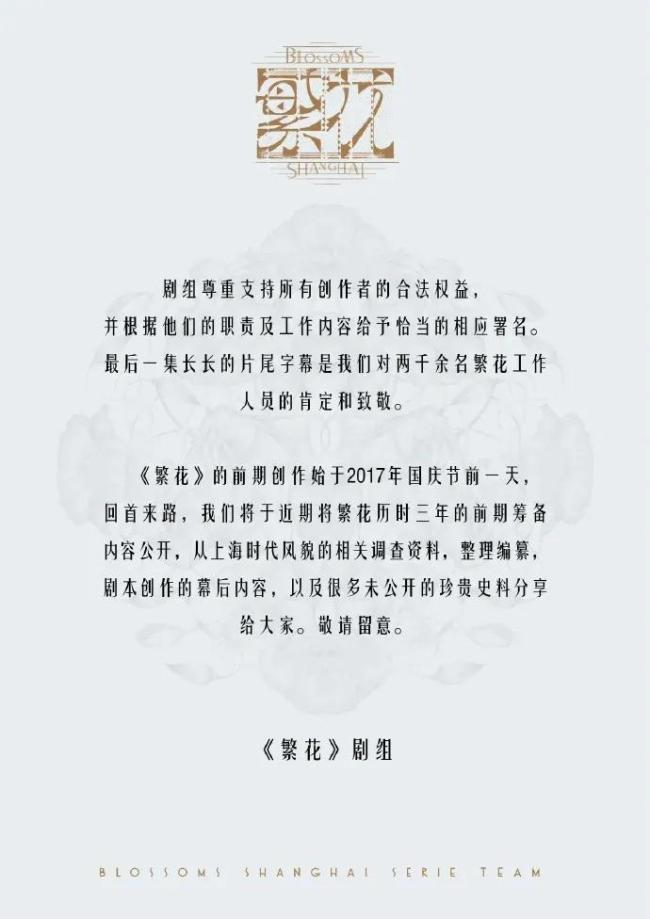 9月20日下午,《繁花》剧组回应称支持所有创作者的合法权益,并根据职责和工作内容给予相应署名,最后一集长长的片尾字幕是对两千余名工作人员的肯定和致敬。剧组还表示将公开历时三年的前期筹备及幕后内容。