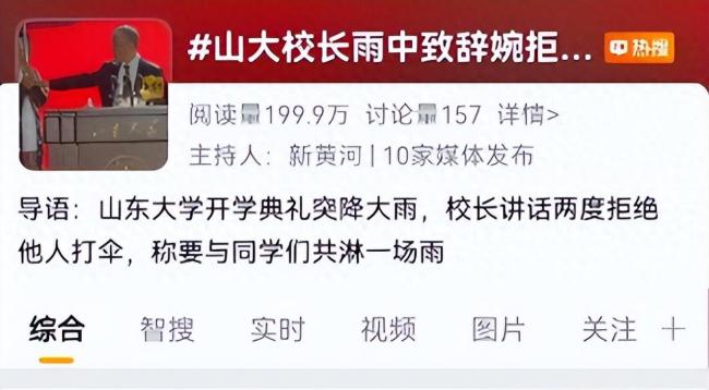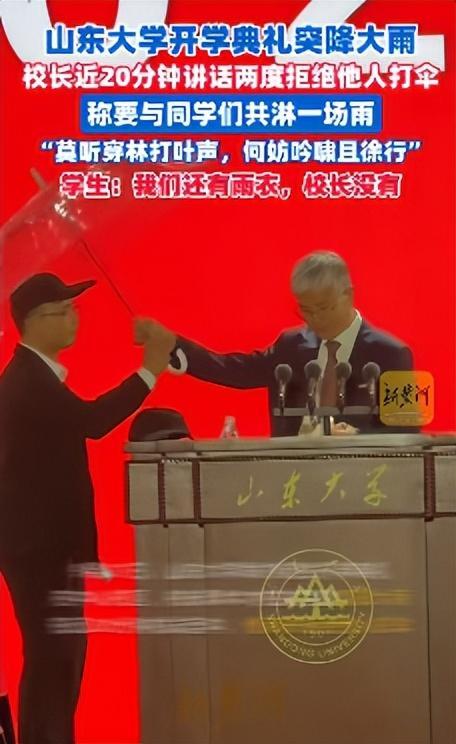 9月28日,话题“山大校长雨中致辞婉拒同学撑伞”登上微博热搜榜,引起广泛关注。此前一天,山东大学在中心校区举行了新生开学典礼。典礼上,校长李术才正在发言时突然下起了大雨。在接近20分钟的讲话过程中,李术才两次拒绝了他人为其撑伞。他表示,希望与每位同学有一次面对面交流的机会,并且愿意和大家一起经历这场雨。
