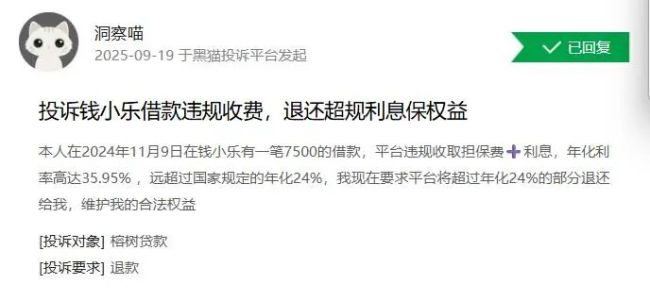 9月19日,一借款人在黑猫投诉平台上投诉称,2024年11月9日在钱小乐借款7500元,平台违规收取担保费+利息,年化利率高达35.95%。
