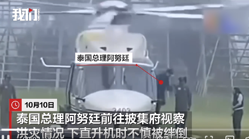 泰国总理下直升机时不慎被绊倒 多人搀扶下站起