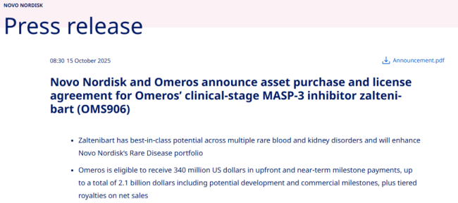 10月15日,诺和诺德与Omeros达成一项资产购买和许可协议,将获得后者处于临床阶段的MASP-3抑制剂zaltenibart(OMS906)所有适应症的全球独家开发和商业化权利。Omeros将获得3.4亿美元的预付款和近期里程碑付款,总计最高可达21亿美元(包括潜在的开发和商业里程碑付款),以及基于净销售额的分级特许权使用费。