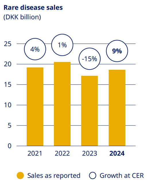 目前,诺和诺德的核心业务是糖尿病和肥胖症,罕见病是其另一潜力板块。根据2024年财报,诺和诺德在罕见病领域的销售额约为186亿丹麦克朗,同比增长9%,约占总营收的6%,核心上市产品包括用于血友病的长效重组凝血因子培妥罗凝血素α和TFPI抗体Alhemo,以及用于生长激素缺乏症的长效生长激素Sogroya等。