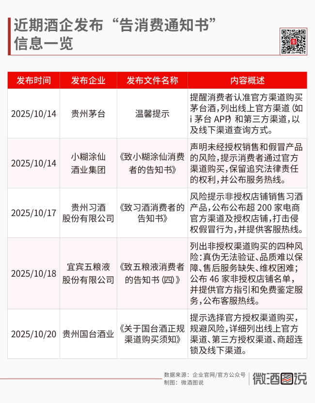 10月以来,多家白酒企业接连发布官方声明,内容直指非授权渠道销售乱象,呼吁消费者通过正规途径购买产品。