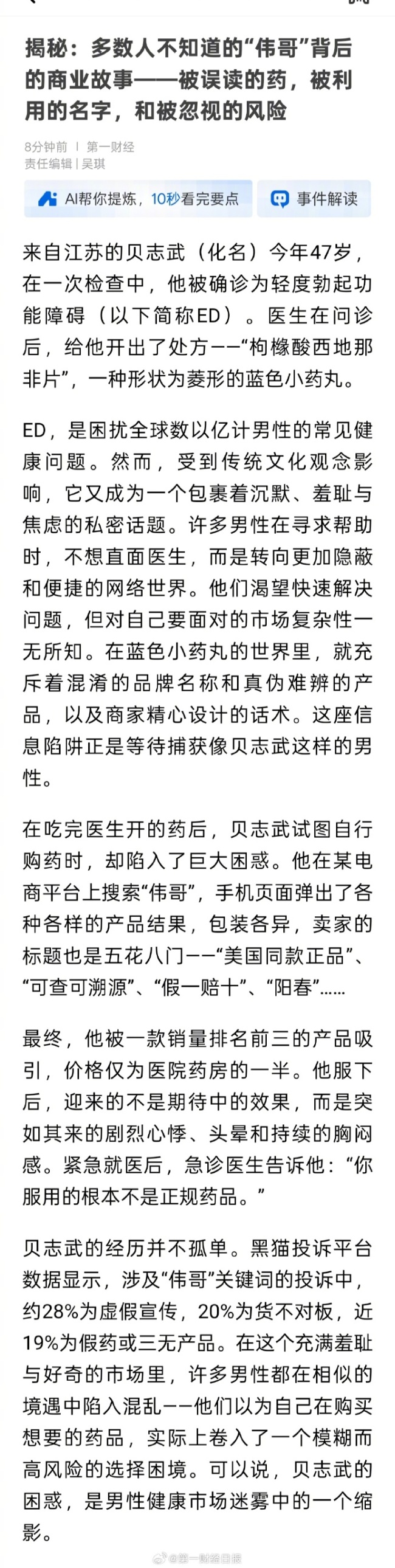 黑猫投诉平台数据显示,涉及“伟哥”关键词的投诉中,约28%为虚假宣传,20%为货不对板,近19%为假药或三无产品。在这个充满羞耻与好奇的市场里,许多男性都在相似的境遇中陷入混乱——他们以为自己在购买想要的药品,实际上卷入了一个模糊而高风险的选择困境。