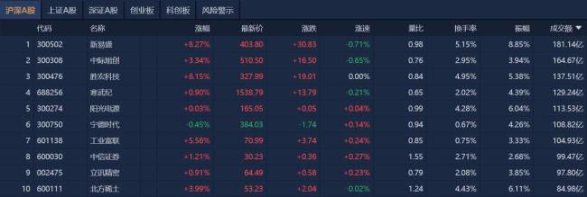沪深两市半日成交额达1.57万亿元,较上个交易日放量3372亿。个股方面,新易盛成交额超181亿元居首,中际旭创和胜宏科技成交额靠前。
