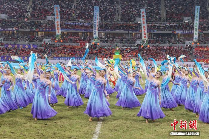 图为比赛中场休息时间,赣州安远县带来的大型歌舞《清清东江水 甜甜赣南橙》表演。中新社记者 刘力鑫 摄